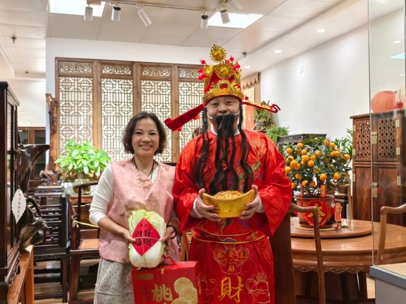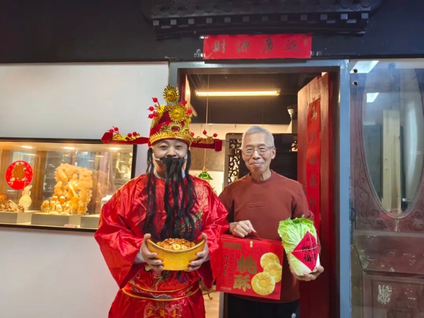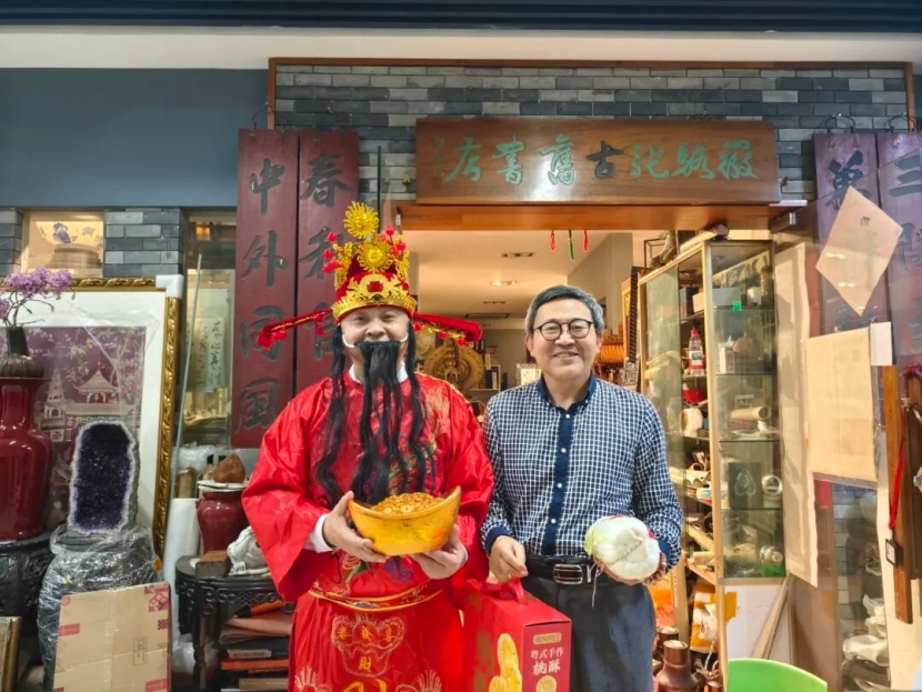 “财神到!接财神”,古玩城管理处工作人员化身财神爷,迈着喜庆的步伐,走到哪里,哪里就有欢声笑语,满满的年味儿和财气扑面而来。财神爷为开门营业的商户送上最诚挚的新春祝福,亲手将寓意美好的福礼送到老板们手中——一颗颗鲜嫩的白菜,谐音“百财”,愿各位老板新一年财源滚滚、客似云来;一块块香甜的桃酥,寓意添福添寿、生意节节高,每一份礼品都藏着古玩城管理处的心意,更载着对商户们新一年的美好期许。